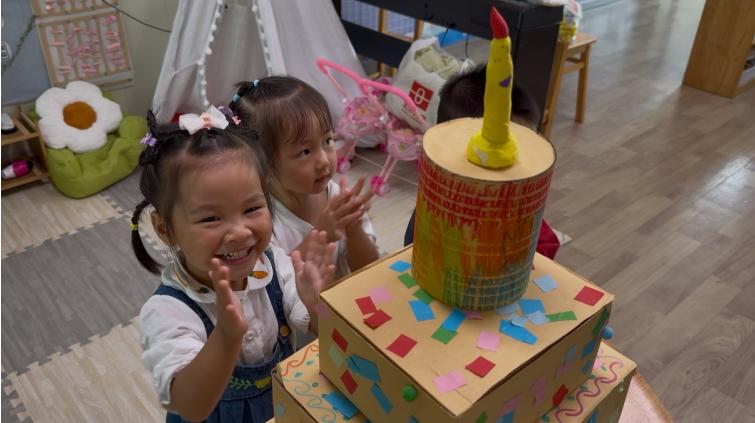 南溪区福临幼儿园小班幼儿以“直接体验”为核心,通过简单互动传递情感。小一班开展“儿歌颂祖国”活动,教师带领幼儿学念《我爱祖国》等简短儿歌,用朗朗童声表达对“祖国妈妈”的喜爱;小二班创设“为祖国妈妈贴蛋糕”场景,幼儿用彩色纸屑、超轻黏土装饰巨型蛋糕模型,在动手操作中理解“庆生”含义;小三班组织“国庆小灯笼接力”游戏,幼儿手持自制红灯笼,在《娃哈哈》的欢快旋律中完成接力,既锻炼协作能力,又感受传统节日与国庆的双重喜庆。