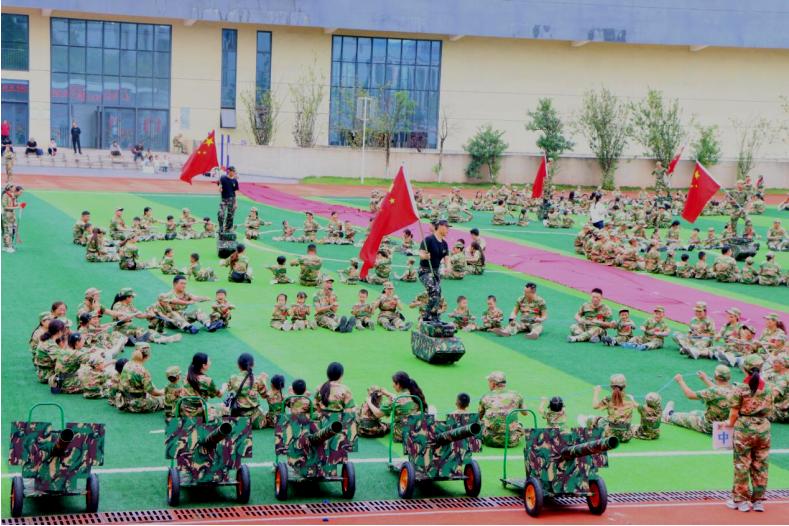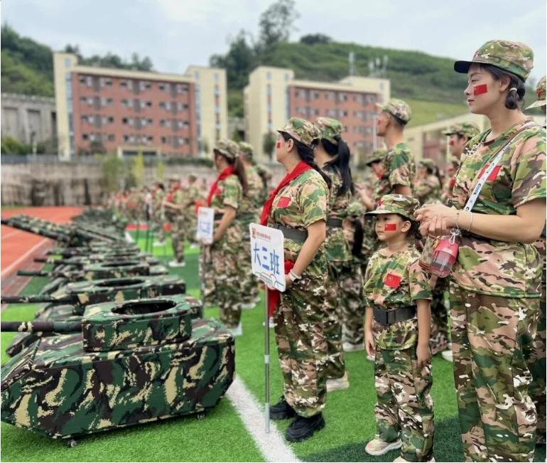在教官与老师的引导下,孩子们身着迷彩服、头戴红军帽,精神抖擞地步入操场。三江新区红星幼儿园大班孩子乘坐“战机”模型,象征空中雄鹰;中班孩子笔直地站立在“炮台”上,展现陆军雄风;小班孩子驾驶“坦克”,俨然铁甲小兵团。家长们也积极参与,与孩子并肩列队,形成一道道迷彩风景线。整个操场仿佛成为一个微缩的“阅兵场”,洋溢着庄严而热烈的节日氛围。