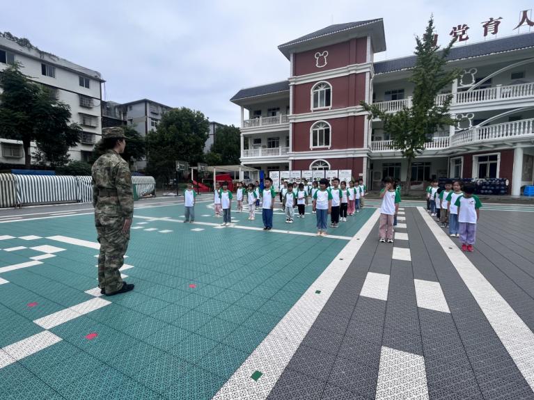晨光微熹时,天府园的操场上已洋溢着别样的 “军营氛围”。伴随着轻快激昂的军乐,“我是小小兵”国防启蒙日正式拉开了帷幕。身着整齐服装的“教官”迈着坚定有力的步伐入场,挺拔的身姿、亲切的笑容瞬间吸引了萌娃们的目光。迫击炮与云炮筒的亮相,更让孩子们眼中闪烁着好奇与向往的光芒,爱国爱军的种子在这一刻悄然萌芽。
