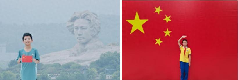 “我和国旗合个影,我为祖国送祝福。”从橘子洲头毛主席青年艺术雕像前到街头巷尾,从小学生到初中生,他们无论身在何处,只要看到鲜艳的国旗,都会庄重地驻足合影。他们或在国旗下敬礼致敬,或手捧国旗展露自豪笑容,用镜头定格对祖国的赤诚之心。