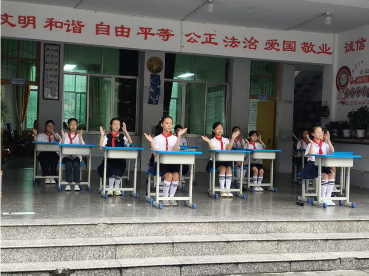 当日清晨,国旗之下,高县逸夫小学校五年级学子身着统一服装,精神抖擞、站姿挺拔,成为校园里一道亮眼的风景线。悠扬旋律响起,展示正式拉开了帷幕:诗朗诵《月是故乡明,国是中国强》中,“海上生明月,天涯共此时”“但愿人长久,千里共婵娟”的经典诗句,被学子们以铿锵又深情的语调演绎,将中秋思乡愁绪娓娓道来,唤起师生心底的家国眷恋;歌曲《今天是你的生日》演唱环节,“我们祝福你的生日,我的中国”的真挚歌词,伴随整齐嘹亮的歌声,传递出对祖国母亲最热忱的祝福;手势舞《涵养文明习惯》则以灵动的肢体语言,将“文明”从抽象理念转化为日常言行指南,呼吁学子们相互监督、共同践行,争做文明好少年。