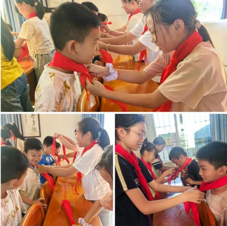 紧接着进入新队员入队核心环节。老队员们手持鲜艳的红领巾,有序为新队员佩戴,手把手教新队员整理红领巾;新队员们眼神坚定,认真感受这份属于少先队员的专属荣耀,彼此的互动让“传帮带”的队友情谊愈发浓厚。
