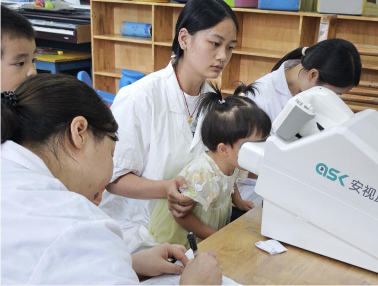 体检现场秩序井然,医护人员分工明确、操作规范,有序开展多项重点检查服务。在口腔健康守护方面,医护人员为适龄儿童实施乳牙全口涂氟,有效提升牙齿抗龋能力、降低乳牙龋病发生率,同时引导儿童养成良好口腔卫生习惯;在生长发育评估环节,通过互动观察的方式,对儿童大运动、精细动作、语言表达等进行系统测评,针对存在发育偏移倾向的儿童,现场给予个性化指导,助力家长与教师精准掌握孩子成长动态;在眼健康筛查中,医护人员借助专业仪器开展屈光检测,全面排查近视、斜视、屈光不正、远视力储备不足及弱视等潜在问题,实现眼健康风险早发现、早干预,为预防儿童视力发育障碍筑牢防线。