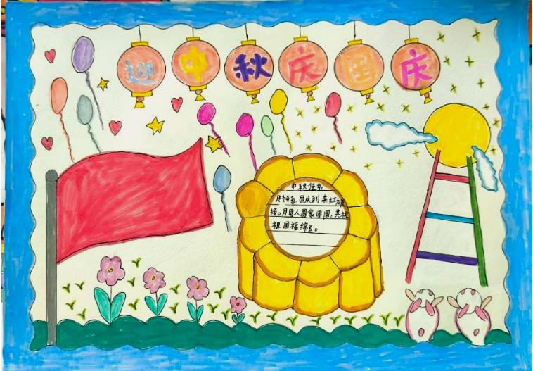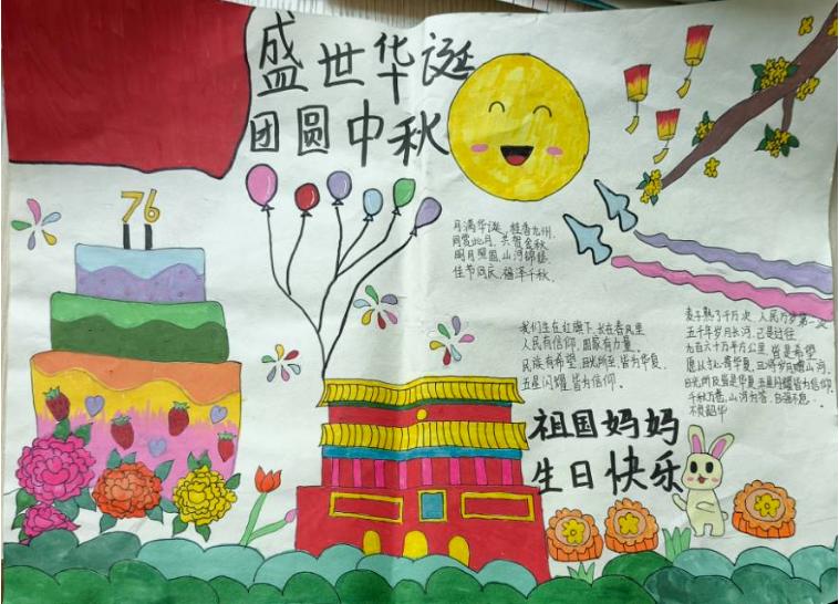 高县逸夫小学校三、四年级学生聚焦“双节同庆一幅画”与“我的家国小书签”创作。在主题画中,“国旗下的中秋家宴”“月亮旁飘扬的五星红旗”等创意层出不穷,国旗、天安门、月亮、玉兔等元素巧妙融合;学生还在画的右下角写下“祝祖国生日快乐,祝全家中秋团圆”等真挚祝福,且严格遵守“红旗不画五角星、姓名班级写于背面”的要求。书签制作同样精致,彩纸为底,正面绘双节元素,背面摘抄“中秋月儿圆”“我爱中国”等短句,兼具美观与文化意义。