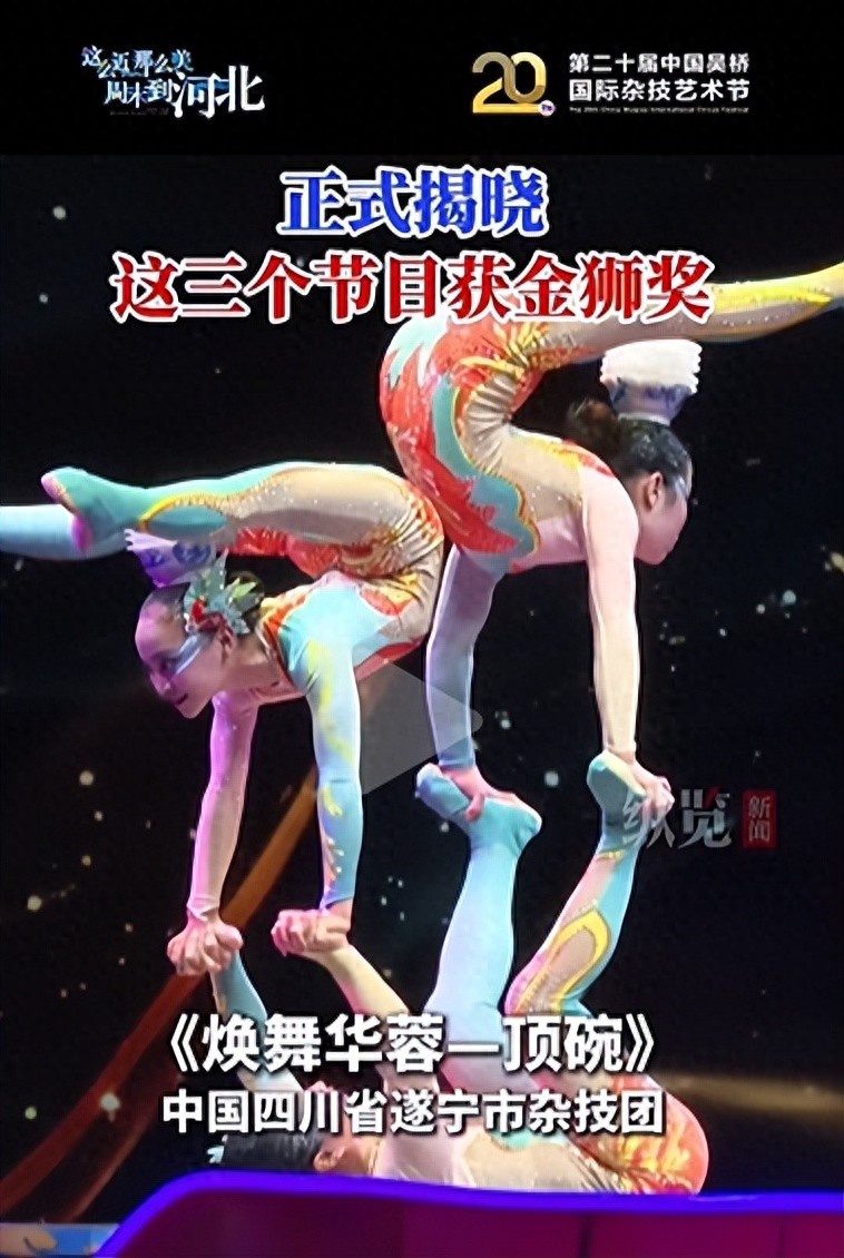 《焕舞华蓉-顶碗》由遂宁市杂技团演员完成,其特点是连贯展示一系列高难度技巧:从对手倒立水平顶开始,紧接着完成头上单手顶、旱水起单手顶、后双滚顶、抱头卡脖顶,形成稳定的三人立体造型;随后,在底座完成翻滚的同时,头上两人完成蹲起动作;高潮部分,底座在无任何扶手支撑的情况下,头上两人以倒立姿态下梯。整个过程中,演员们既要展现扎实过硬的基本功,又要确保头顶的碗稳稳不落。这一连串令人屏息的高难度技巧表演,带给观众强烈的视觉震撼与惊叹。(来源:遂宁文联)
