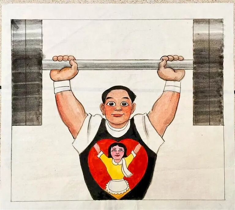 冯湘的作品画面奇特:一位身材健硕的男性举重运动员敞开胸膛,心中显现一位女性正在全力协助的场景。