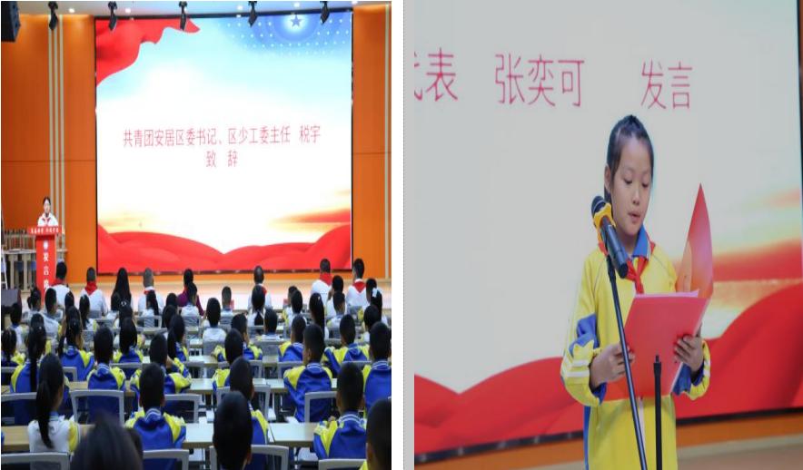 共青团安居区委书记、区少工委主任税宇致辞,她对即将入队的新队员表示祝贺,并勉励全体少先队员树立远大理想,努力学习,成长为担当民族复兴大任的时代新人。少先队员代表张奕可同学分享了自己的少先队生活感悟,表达了对新队员的欢迎与期许。