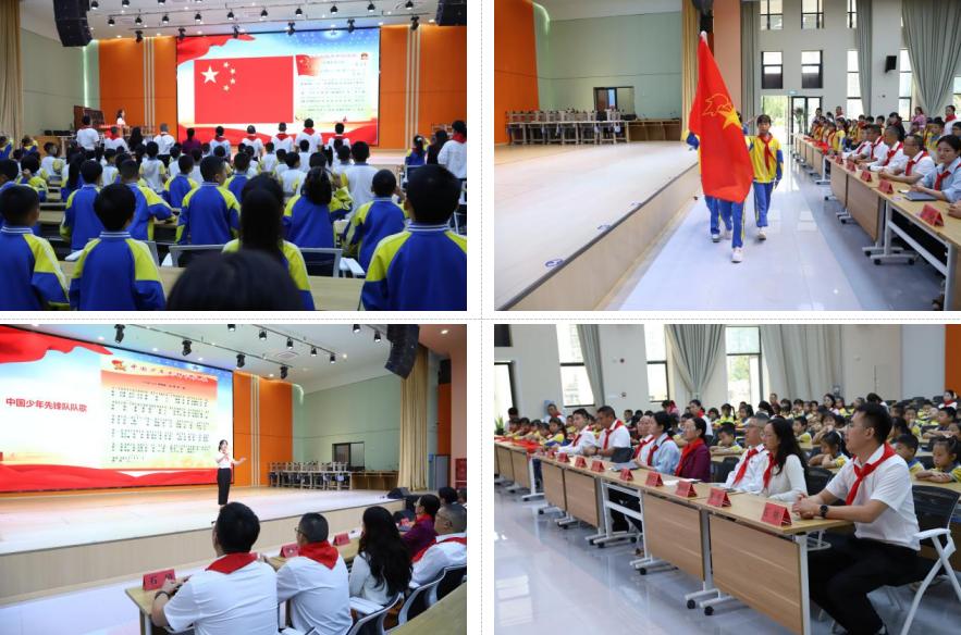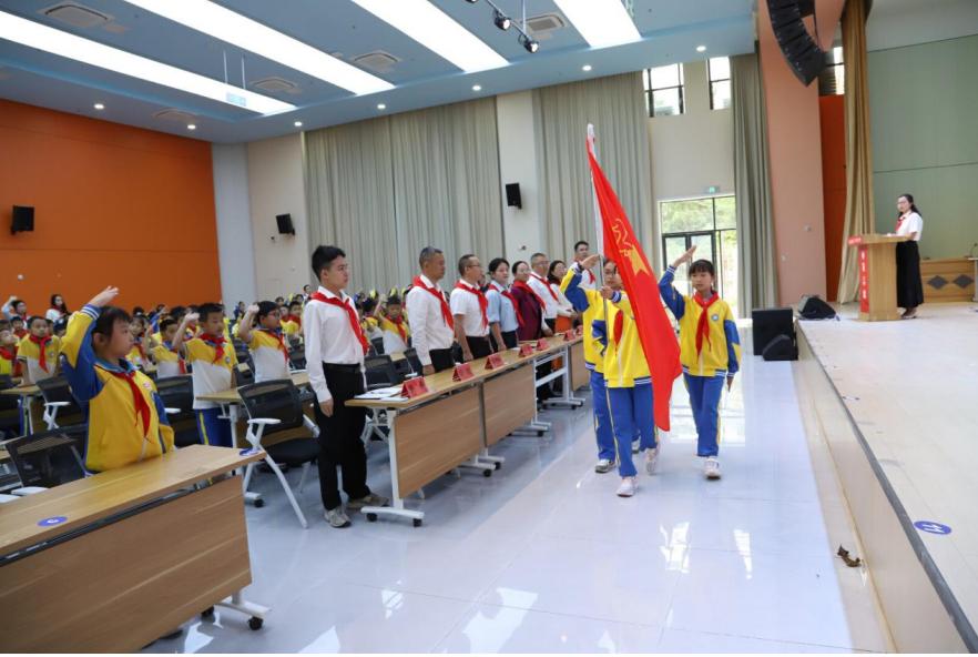 仪式在庄严的国歌声中拉开帷幕,伴随着激昂的《出旗曲》,旗手迈着整齐的步伐护送队旗入场,全体少先队员行队礼致敬。随后,全体人员齐唱《中国少年先锋队队歌》,歌声嘹亮,展现了少年队员的蓬勃朝气。