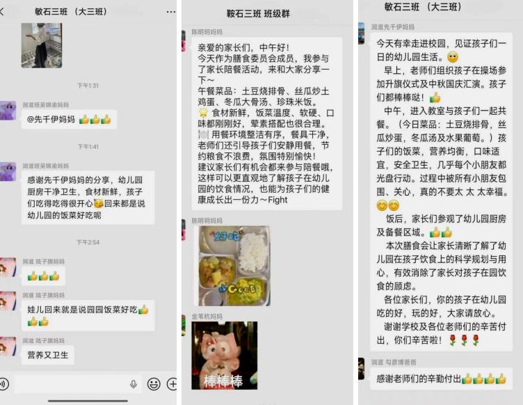 在后续的交流中,家长们真诚地表示:“从食材溯源到卫生细节,处处可见幼儿园的用心。”“亲身体验之后,更加认同幼儿园透明、科学的膳食管理模式,也愿意更积极地参与到家园共治中。”班级群中的一字一句,传递的是信任,也是期许。