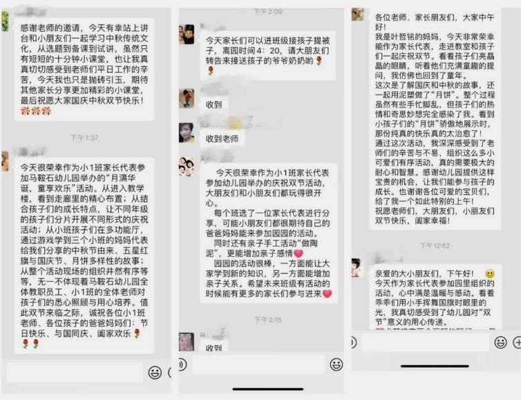 当节日的欢声笑语渐渐归于平静,家长群里温暖的文字,正诉说着那段美好时光的延续。字里行间满是亲子共赴文化之约的欢喜,更藏着对家园共育的认可与信赖 。从陪孩子揉制月饼、到一同聆听双节故事,家长们不仅见证了孩子的成长,更感受到家园同心,护航童年的力量。这份双向的奔赴,让节日的意义超越欢庆,成为滋养孩子成长的珍贵养分,也让家园共育的纽带愈发紧密。
