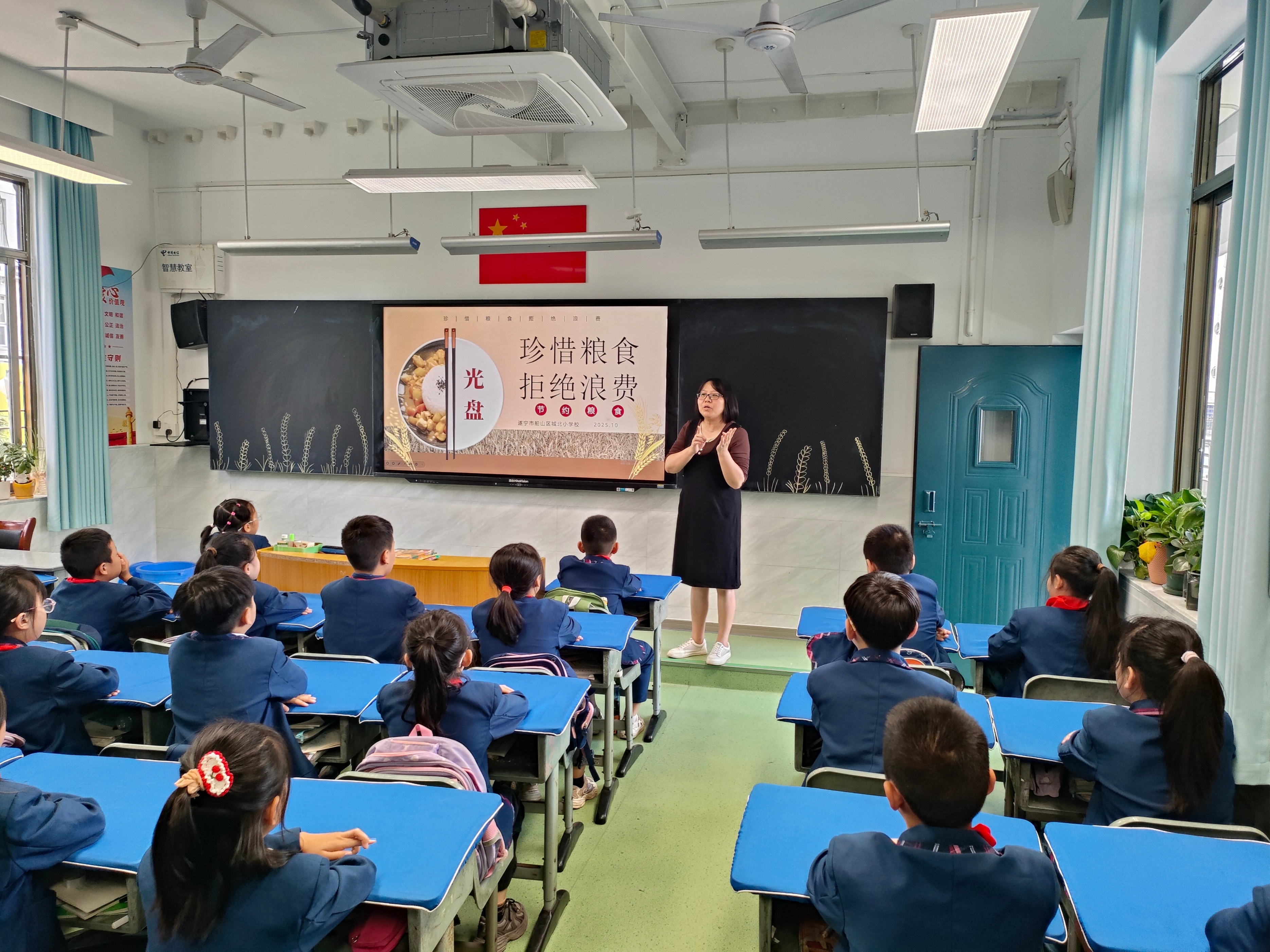 各班级主题班会同步开讲,成为传递节约理念的主阵地。低年级课堂上,老师通过动画《一粒米的旅行》,生动展现稻谷从播种、生长到加工成米饭的全过程,学生们捧着实物稻穗,直观感受“每粒米都经得住风雨”;中高年级则以“粮食数据小课堂”形式,对比全球粮食短缺现状与校园浪费现象,邀请食堂张师傅现场分享“每天剩余饭菜的处理量”,让学生在真实数据前触动反思。部分班级还设计“挑食浪费小辩论”“按需取餐模拟游戏”,让学生在互动中明晰“光盘”的意义。