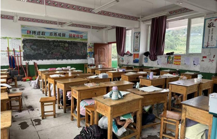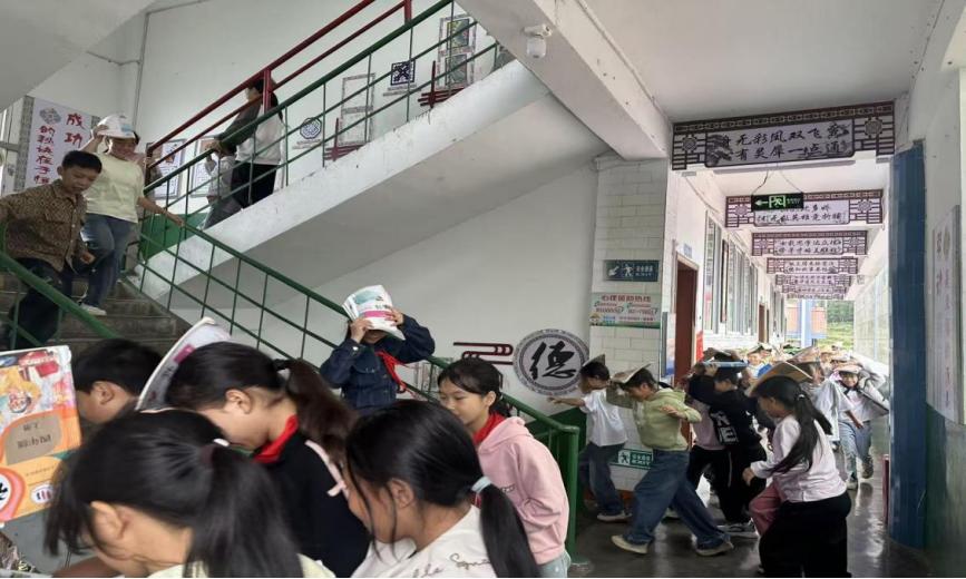 上午10:20,随着地震警报响起,演练正式开始。上课教师立即停止授课,转而指挥学生迅速抱头,蜷曲身体,躲在各自的课桌下或课桌旁,尽可能用书包或书本保护头部,进行紧急避险。随后,筠连县团林苗族乡中心校全体学生在班主任和任课老师的指挥下,按照预定的疏散路线,快速、有序地从教室前后门撤离。到达指定的安全区域后,各班立即清点上报人数。