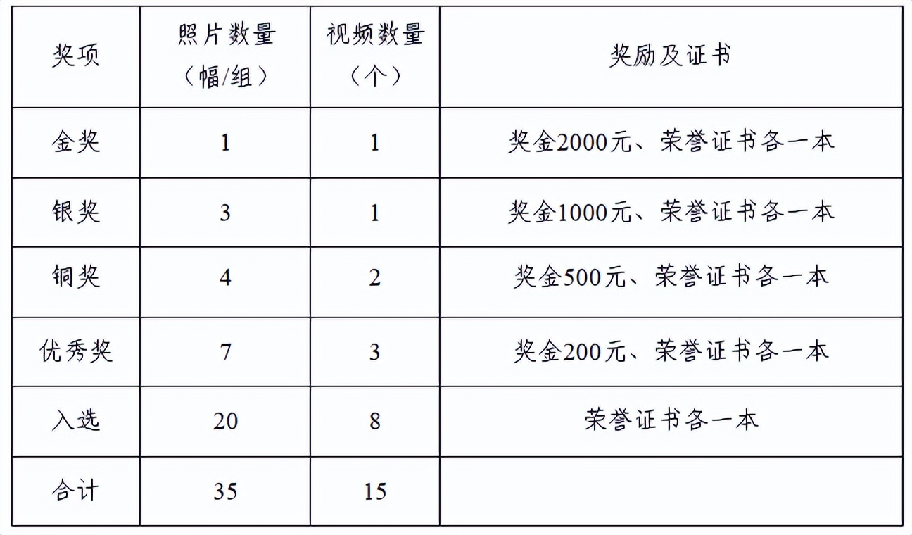 本次摄影大赛的奖项设置如下