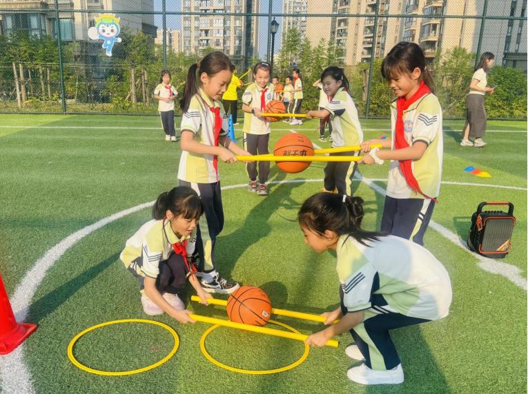 热身结束后,喻老师结合青少年身体发展特点,详细讲解并示范了多项趣味体适能游戏。从敏捷梯上的灵活穿梭,到呼啦圈阵中的蹲跳挑战,再到需要团队协作的篮球运送游戏,以及创意十足的“纸衣跑”项目,每一个环节都精心设计。老师们耐心指导,孩子们踊跃参与,现场氛围热烈而有序。