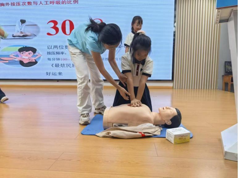 课堂上,阳老师结合学生日常生活场景,讲解急救要点:针对溺水、触电等突发情况,先通过“看呼吸、喊回应、摸脉搏”判断是否需要心肺复苏,再按“呼救找人、打120找AED、清异物护颈椎”的步骤准备,最后规范完成按压与人工呼吸的配合。这些实用知识,让原本对“急救”陌生的孩子们快速建立认知。