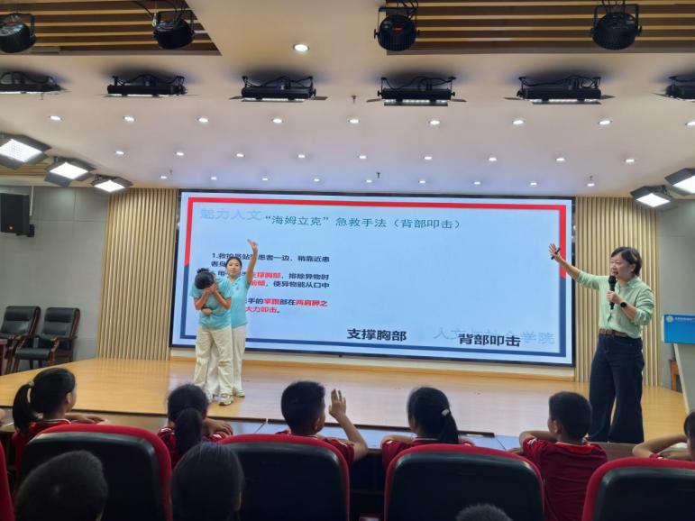 谈及校园高频的气道异物梗阻问题,阳老师的“剪刀石头布”教学法引发阵阵互动。“握拳是‘石头’,顶在肚子中间,另一手包着用力挤!”她一边示范,一边教孩子们独自遇险时用桌角、椅背自救的方法,生动教学让同学们轻松掌握关键技能。