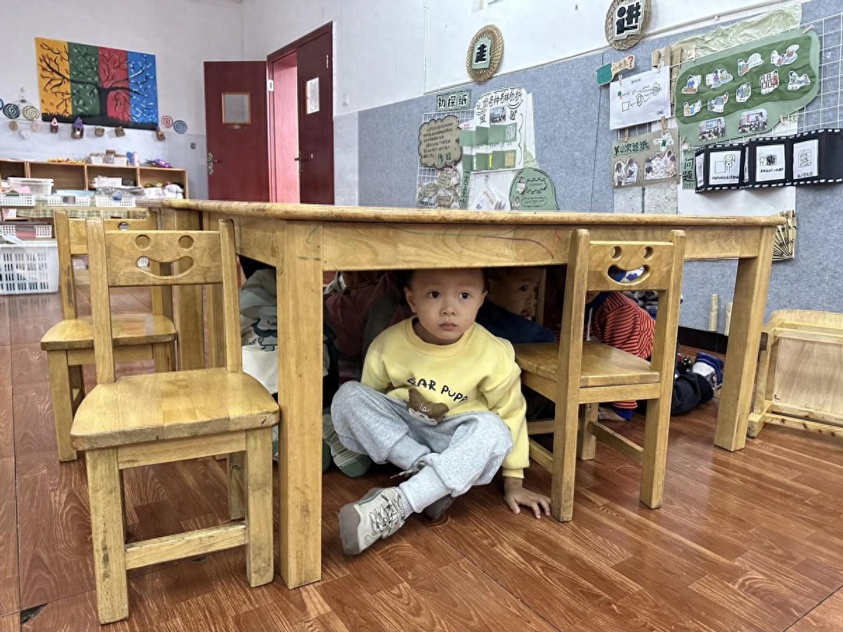 演练前,叙州区高场镇中心幼儿园各班教师结合幼儿年龄特点,通过绘本故事、情景模拟等形式,生动讲解了地震发生时的“躲避要点”(如躲在桌下、远离窗户)和“疏散规则”(不推挤、听指挥),让幼儿在轻松氛围中掌握应急知识。上午9:20,模拟地震警报声响起,教师立即引导幼儿双手抱头、闭眼,快速躲到课桌下方或墙角等安全区域;待“主震”过后,疏散信号发出,教师带领幼儿弯腰护头,按照园区预设的安全路线,快速、有序地撤离至户外操场指定集合点。