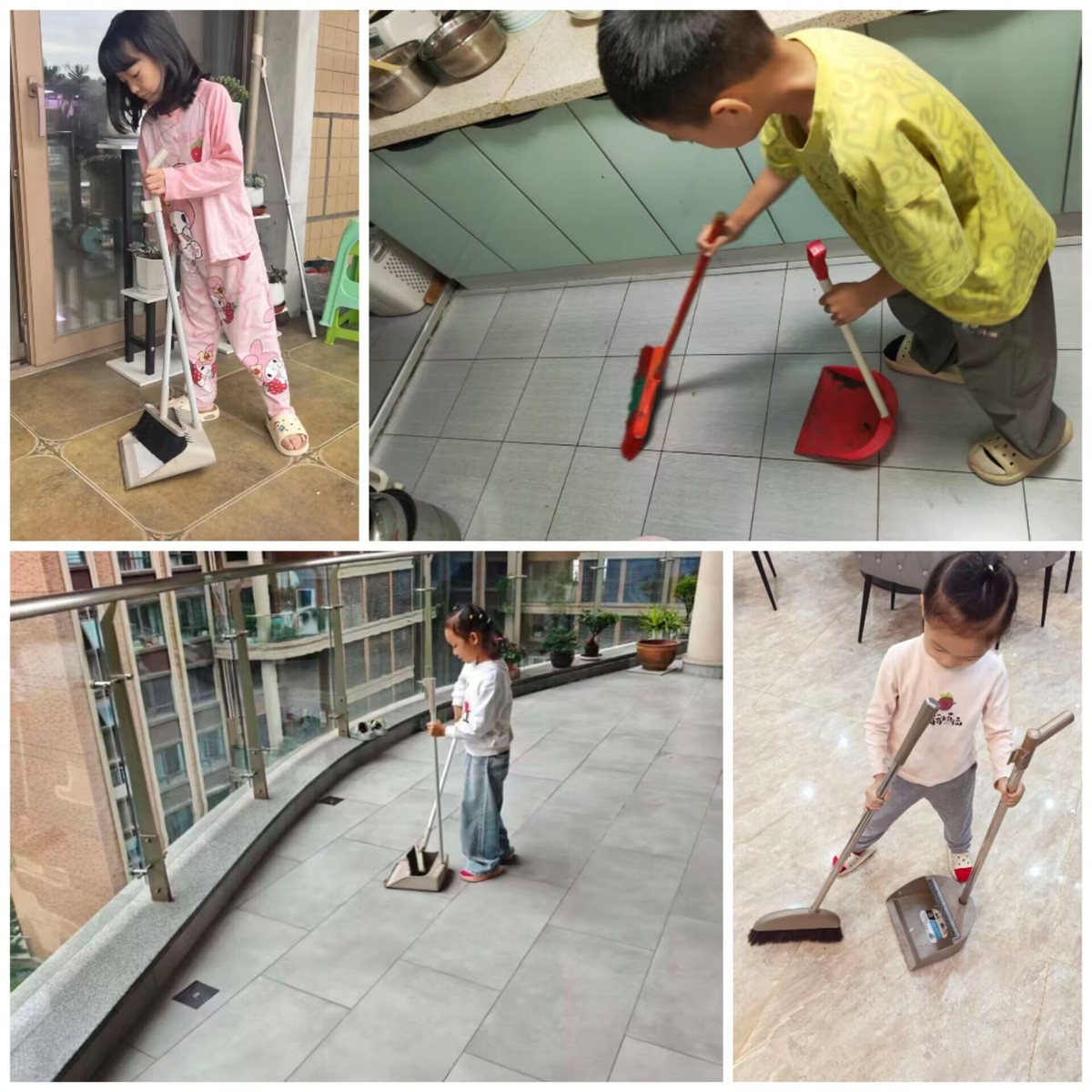活动中,孩子们认真的模样格外动人:有的双手握紧扫把杆,把客厅的灰尘一点点地扫向角落;还有的遇到桌底缝隙,便俯身调整角度,不让一点垃圾“漏网”,动作虽稍显稚嫩,却有条不紊。孩子们已经学会扫地啦!真的长大啦!