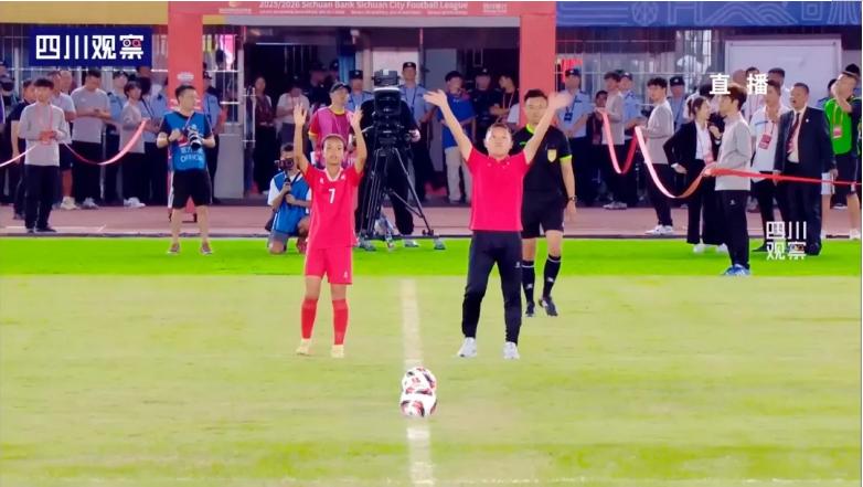 雍旭东与张成珂作为开球嘉宾站上“川超”联赛赛场(视频截图)