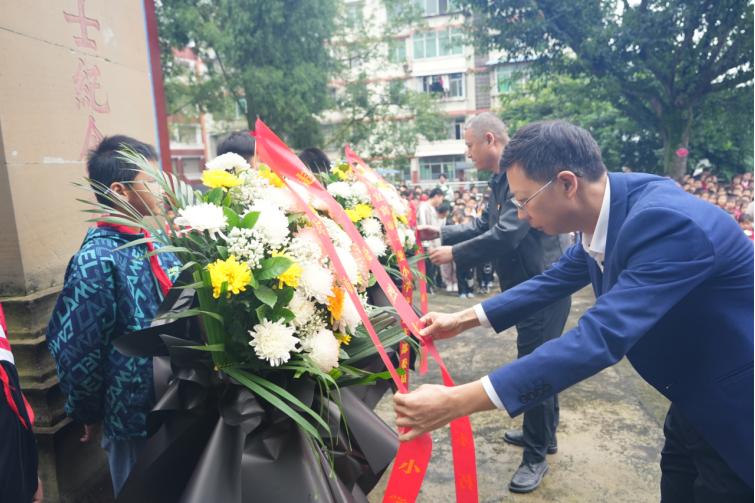 在献花环节,宜宾市一曼小学校领导为赵一曼烈士整理花篮缎带,全校学生依次敬献菊花并鞠躬致敬,以朴素而庄重的方式表达对赵一曼烈士的缅怀之情。
