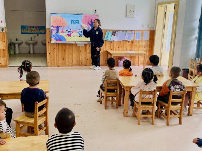 活动中,江安县夕佳山镇中心幼儿园化身为一个充满探索乐趣的“节气乐园”。孩子们首先通过老师的生动讲解和有趣的动画,了解了霜降节气的物候特点与“吃柿子”、“赏秋叶”、“吃萝卜”等传统习俗,一个个睁大了好奇的眼睛,充满了求知的渴望。