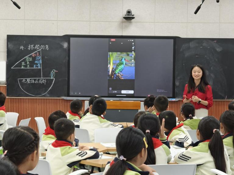 肖竟老师执教的《搭船的鸟》,创设单元大情境——最美发现者征集令。采用AI导入新课,激发学生主动探究欲;借助AI工具,引导学生用“翠鸟有翠绿的羽毛、红色的长嘴”等完整口令描述特征,生成专属翠鸟图片,让文字描写与视觉呈现联动,深化对细节描写的理解。