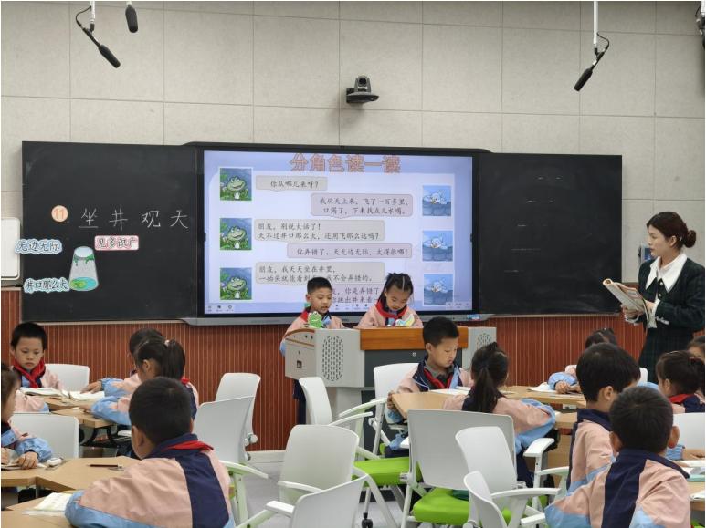 刘佳艺老师执教的《坐井观天》:巧用课本剧表演,让学生分别扮演“青蛙”与“小鸟”,在对话演绎中理解寓言寓意。