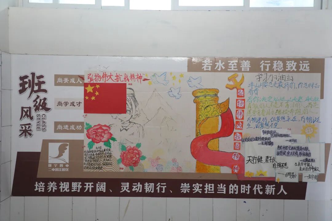 初二年级作为承上启下的关键时期,以“砥砺前行,绽放光彩”和“弘扬伟大抗战精神,做光荣自豪中国人”为主题,展现了学子们的坚毅与担当。各班文化墙或以时间轴呈现奋斗历程,或用历史图片、英雄事迹重温峥嵘岁月,将个人成长与家国情怀紧密相连,激励着同学们在学习的道路上不畏艰难,勇往直前。