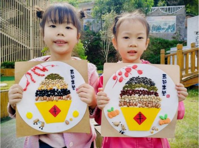 在《情暖重阳》创意手工活动中,孩子们用作品传递真情:小班以手指点画、棉签画创作“茱萸”(寓意辟邪求吉);中班用水粉、撕贴技法制作“盛开的菊花”;大班巧用豆类、米粒等做出“五谷丰登贴画”(寓意美好)。这些充满童趣的作品,承载着孩子们对长辈最纯真的祝福。