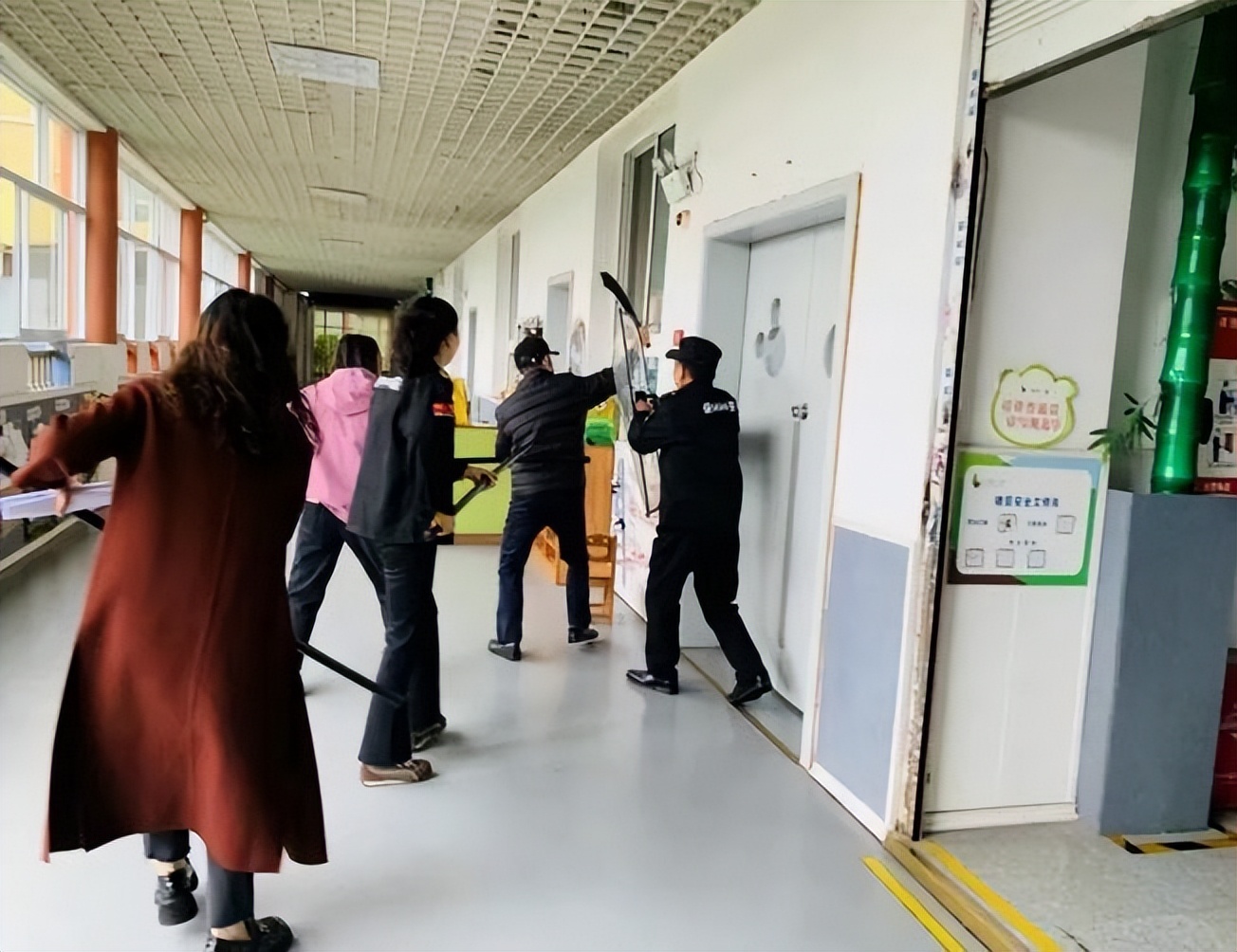 场景模拟 ,增强防范意识。10月27日上午9点30分,幼儿园的孩子们有的在户外玩耍、有的正在班级开展活动,“歹徒”假意询问保安,并试图冲进幼儿园,门卫迅速拉响警报,听到信号,全园立即停止活动,户外班级迅速在最短的时间内组织引导幼儿逃离到就近安全的教室并关好门窗,持棍防止歹徒进入班级,幼儿园应急小队紧急行动,同时按防暴应急预案要求手持棍棒、钢叉等,将“歹徒”围住,临危不乱,与“歹徒”周旋,设法牵制“歹徒”,在“歹徒”想要趁机逃跑时,大家合力迅速将“歹徒”制服。