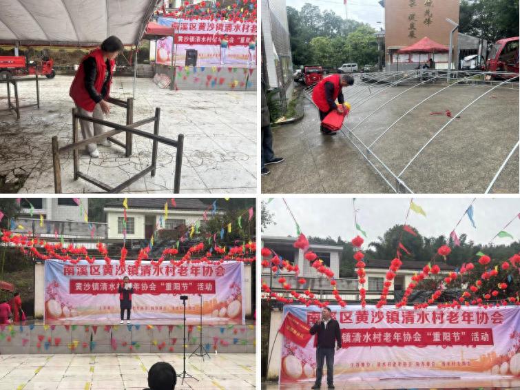 活动开始,志愿队和南溪区黄沙镇清水村的邻里乡亲为活动场地搭筑帐篷。在庆祝环节中,老协会主席与清水村支部书记吴佳乐分别致辞,向全体老年朋友送上节日的诚挚问候与美好祝福。
