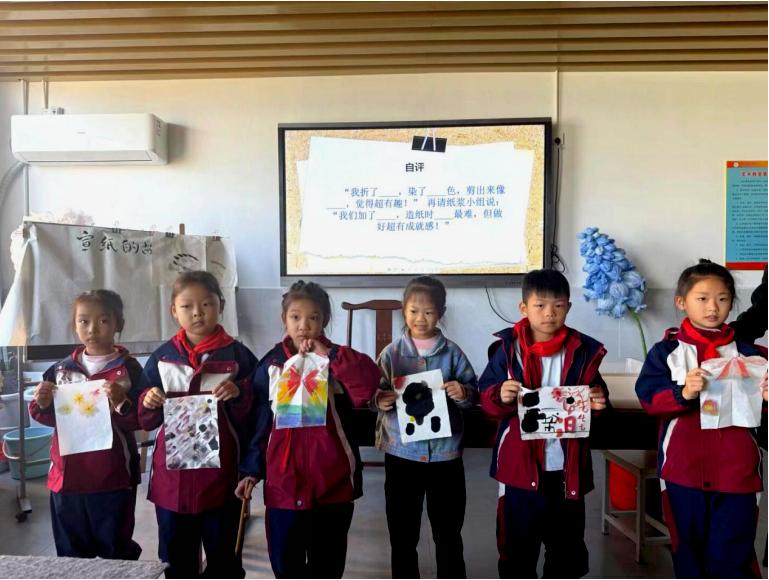 本次公开课由梁老师执教,课堂以“三丈三”宣纸这一人类非物质文化遗产的视频导入,瞬间将学生带入传统文化的情境。随后,教学层层递进:在“宣纸工艺我知道”环节,学生们不仅学习了古法造纸的智慧,更亲身体验“捞纸”,在劳动实践中感悟匠心精神;在“宣纸材质我了解”环节,学生通过触觉、视觉和滴墨实验,以科学探究(智育)的方式分辨生宣、熟宣的特性;最后的“宣纸折叠画”创作将活动推向高潮,学生们折、染,一幅幅充满奇思妙想的作品在欢声笑语中诞生,美育与创意实践得到了完美结合。整堂课,学生手脑并用,情智共生,深刻感受到了传统材料宣纸所蕴含的无限艺术可能。