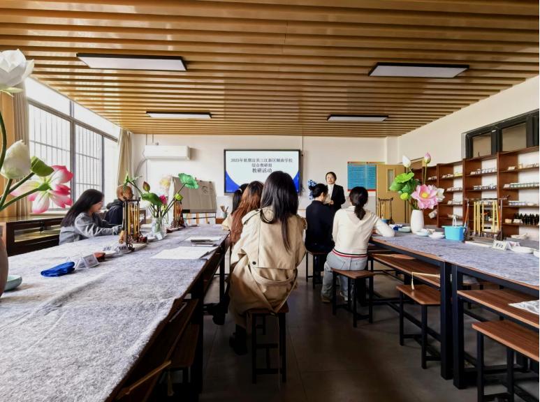 活动始于扎实的集体备课。三江新区顺南学校综合组教师齐聚一堂,共同为本课把脉定向。备课环节超越了简单的教法讨论,紧紧围绕核心素养的落地,设定了清晰的四维目标:引导学生在“触摸与观察”中达成审美感知;在“滴染创作”中完成艺术表现;在“折、染”的实践中激发创意实践;最终在了解宣纸非遗文化的过程中深化文化理解。此次备课精准的将智育、劳育、德育与美育目标有机融为一体,为打造一堂高质量的五育融合课奠定了坚实基础。