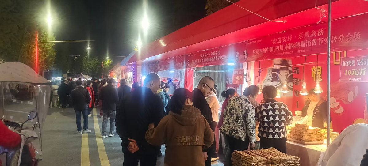 在挤满人群的展销会现场,搭建的展位整齐排列着,商贩们叫卖着各自的商品,食品饮料、家居用品、服装服饰、工艺品、玩具类等众多产品琳琅满目,应有尽有。夜幕中,各类小吃的香气扑鼻而来,相互交织,好似在空中“打架”,如此景象,把热闹的安居老街妆点得更加璀璨。