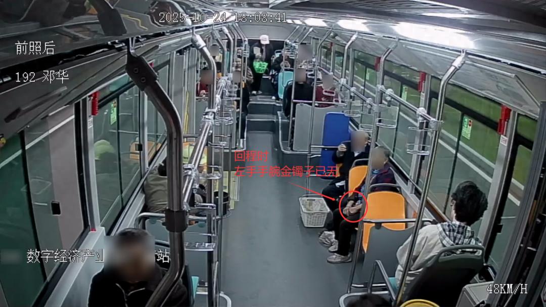10月25日上午9时许,遂宁市公安局反恐特警支队接到指挥中心指令:76岁的朱婆婆报警称,其佩戴的金手镯于前一日傍晚6时许在公交车上“被盗”。接警后,民警迅速处警。经了解,朱婆婆在钟灵毓秀小区对面的菜地劳作后,与老伴从万象汇站乘坐公交车回家,到家后发现左手佩戴的重约30余克、购买价约1.3万元的金手镯不翼而飞。