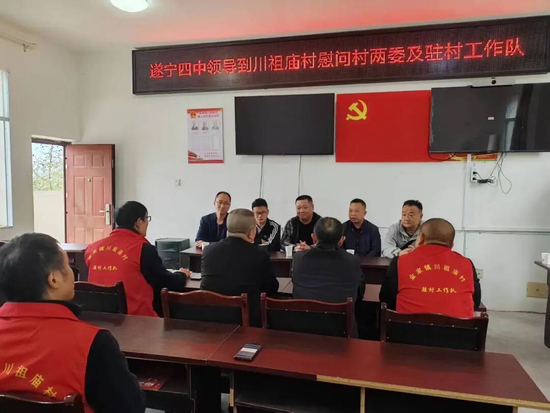 为扎实推进乡村振兴帮扶工作,深入了解驻村实际情况,10月27日、29日,遂宁市第四中学校党总支书记王强带领校领导班子成员及有关干部,先后前往船山区桂花镇黄龙村,射洪市金家镇川祖庙村、涪西镇斑竹村,开展实地走访调研,看望慰问学校选派的驻村帮扶干部,并与当地村干部进行深入交流。