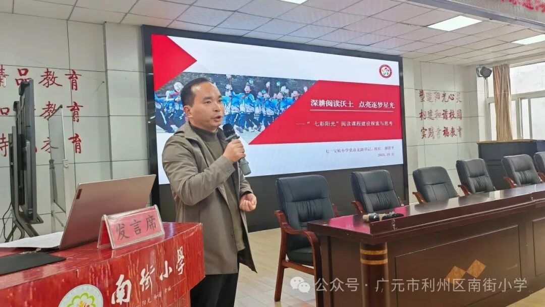 樊文忠名校长工作室成员,七一宝轮小学校长郭思平以《深耕阅读沃土,点亮逐梦星光》为题,聚焦阅读课程整合、管理机制优化,助力学生阅读素养腾飞。