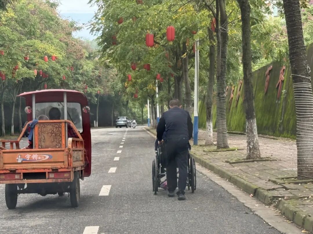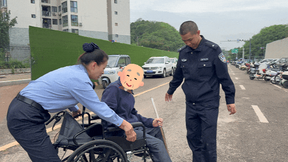 辅警陈勇一路推着轮椅缓步护送
