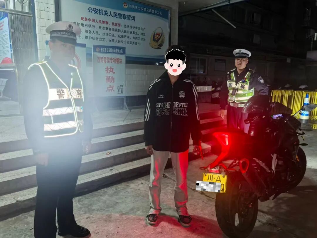 近日,射洪公安110指挥中心接市民举报有人在沱牌大道飙车炸街,交管民警接警后,随即开展摸排调查。通过监控和走访临街群众,基本确定驾驶人员信息后,执勤民警随即在沿线路段布控,最终在新阳街(银行口)锁定涉事车辆,同时发现还有一辆赛摩随行。