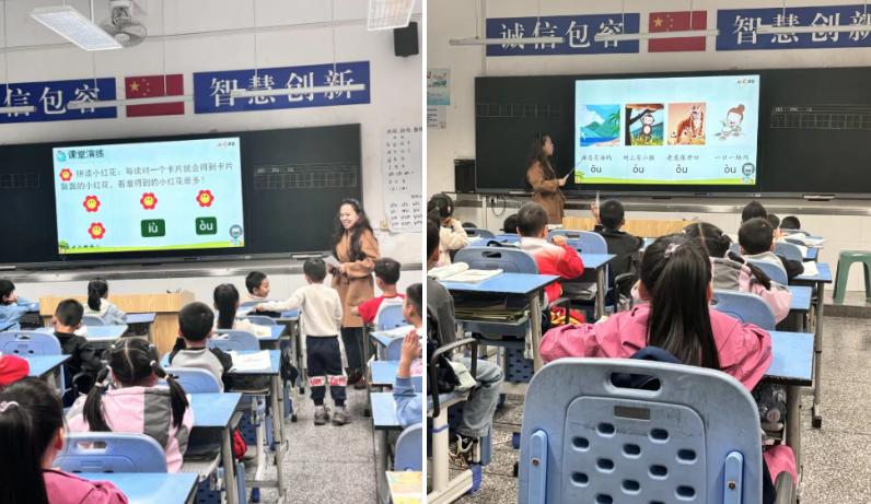 学生层面:通过情感化、游戏化的教学设计。课后调查显示,92%的学生表示“喜欢上语文课”,85%的学生能主动向家长分享课堂所学知识,《ao ou iu》、《汉语拼音》的发音、书写正确率分别提升,孩子们的学习积极性提升