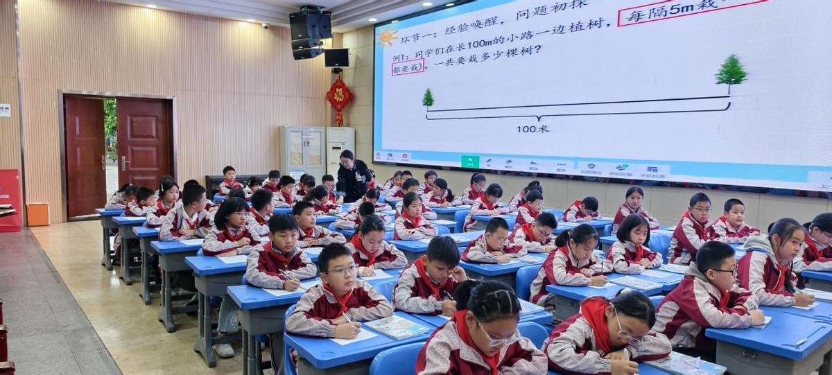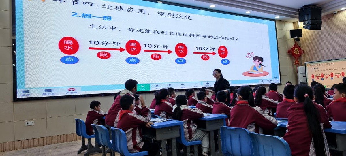 活动的第一幕重头戏,是向攀老师带来的课例展示——人教版五年级上册《植树问题》。向老师以真实的生活情境导入,引导学生从具体问题中抽象出数学模型,通过自主探究、合作交流,亲历“化繁为简”、“一一对应”等数学思想的形成过程。