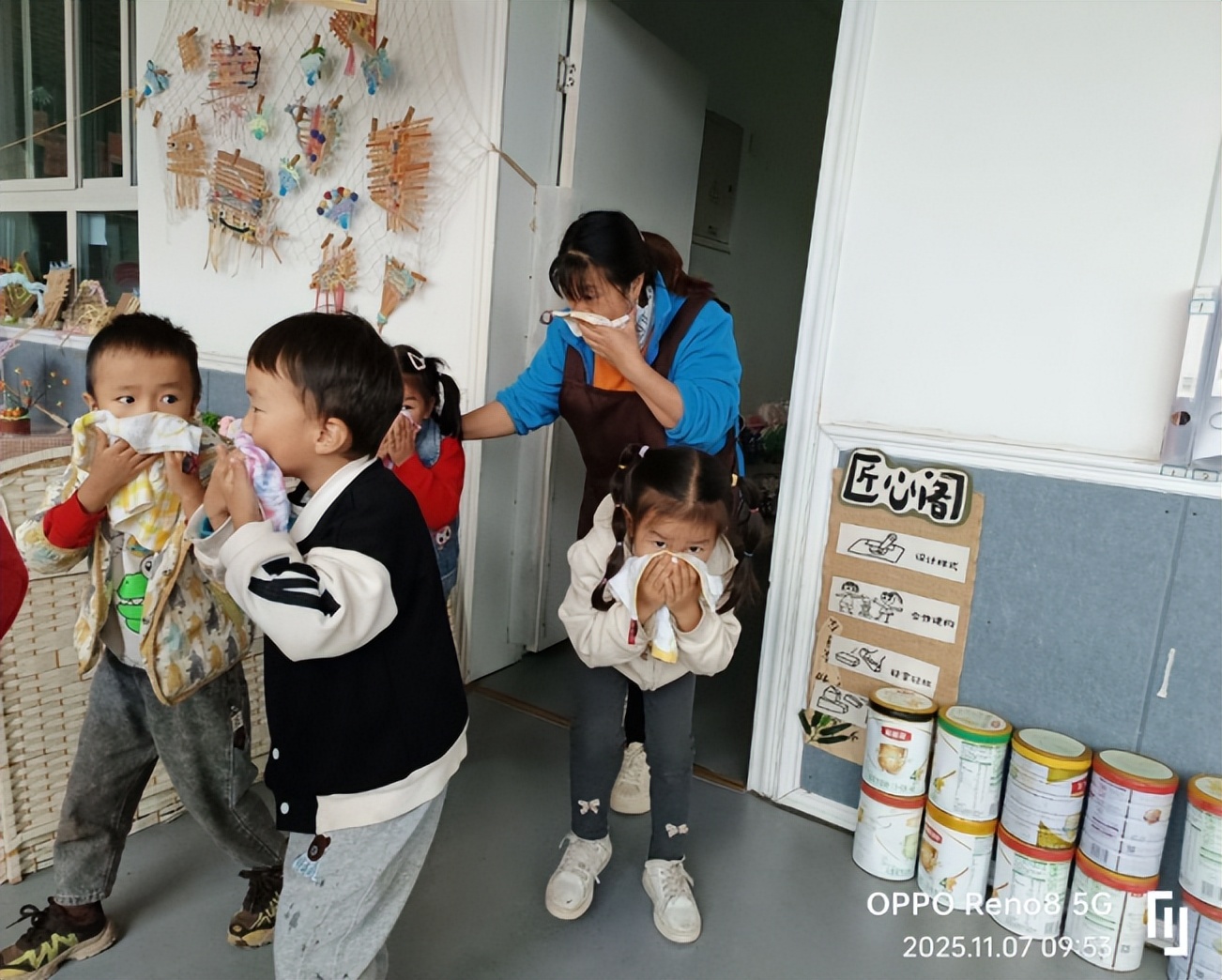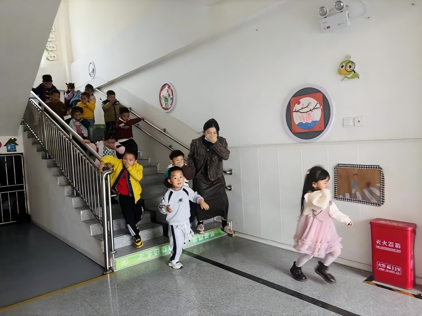 上午9时53分,一股浓烟从大一班教室门口向楼道弥漫,随着火灾警报信号的响起,演练正式开始。各班教师迅速反应,沉着有序地组织幼儿用手、衣袖或湿毛巾捂住口鼻,弯腰低姿,沿着最近安全出口快速向操场安全区域疏散。