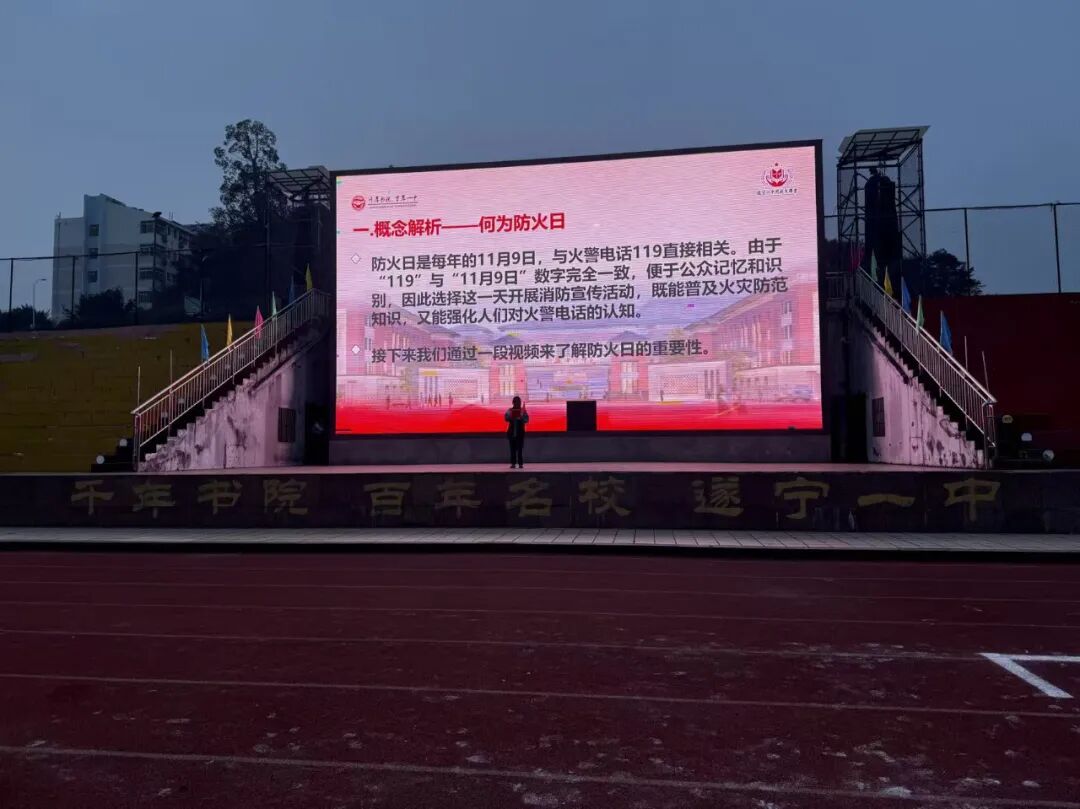 今年11月9日,是全国第34个消防日,活动主题是“全民消防、生命至上——安全用火用电”。为筑牢校园安全防线,提高全体师生的消防安全意识,遂宁一中积极响应上级号召,围绕主题,精心组织并开展了一系列消防安全教育活动。
