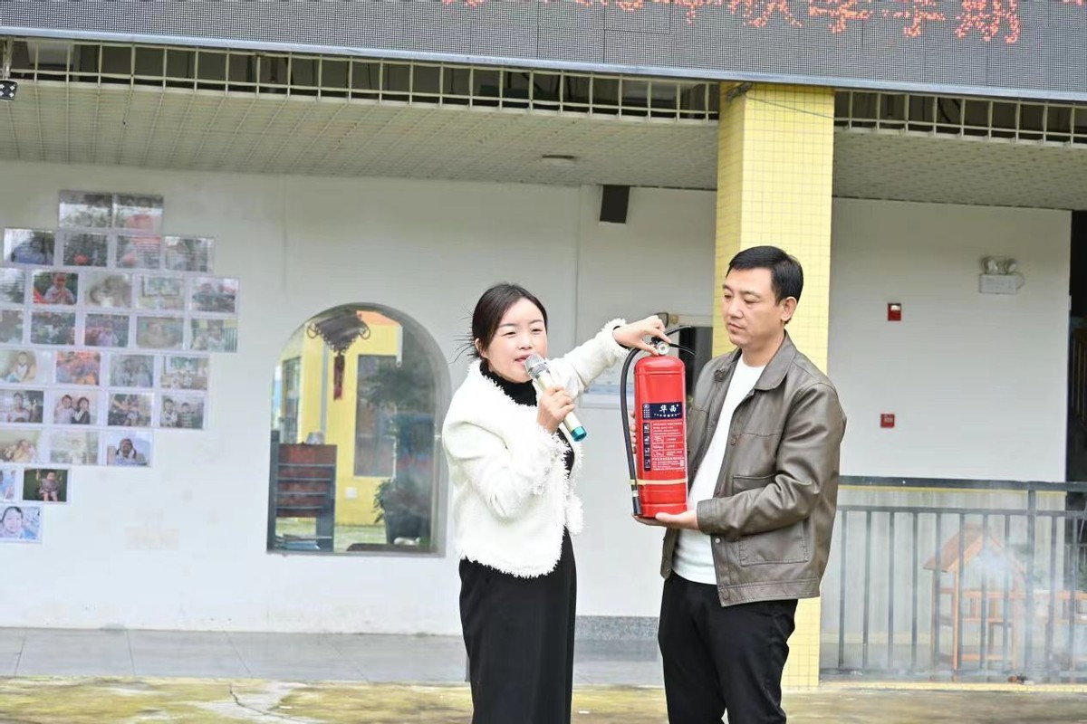 演练前,各班教师已对幼儿进行消防安全知识培训,明确疏散路线与注意事项。14:50警报声响起,全体师生迅速行动,用毛巾、衣物等捂住口鼻,弯腰沿墙角有序撤离。小班、中班直接前往内操场,大班从二楼楼梯安全下楼,全程快速且井然有序,无拥挤踩踏情况。到达集中点后,各班教师立即清点人数并上报。随后,副园长刘佳现场讲解并演示灭火器使用方法,让教职工进一步掌握消防实操技能。