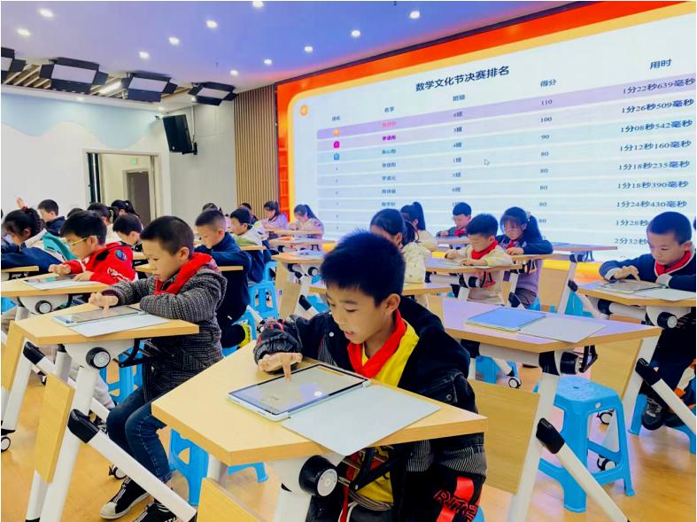 除口算外,南溪区福临小学校一、二年级的七巧板比赛中可以看到七巧板在孩子们稚嫩的手中翻转、组合,抽象图形瞬间化作飞鸟、小舟。在三、四年级的华容道比赛中,孩子们手指灵活地在滑块上舞动,直到棋盘恢复为标准状态。他们将棋盘视为战场,争分夺秒,全神贯注地投入其中,与时间赛跑。五、六年级的复原魔方比赛上,魔方在同学们手中飞速旋转,色彩斑斓的色块逐渐归位。