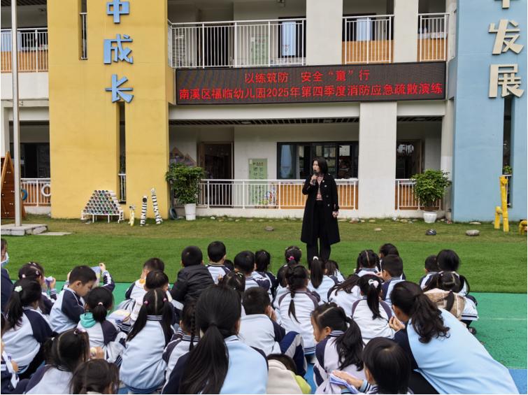 演练后,南溪区福临幼儿园安保主任对活动进行了点评,该园园长朱春燕作总结讲话。她指出,本次演练以“全流程、全岗位、全场景”为标准,全面检验了园所应急体系的执行力: 幼儿动作规范、情绪稳定,展现了日常安全教育的成效;教师分工协作、责任到位,体现了“安全第一”的责任感;消防维保人员全程指导,确保了演练的科学性与安全性。