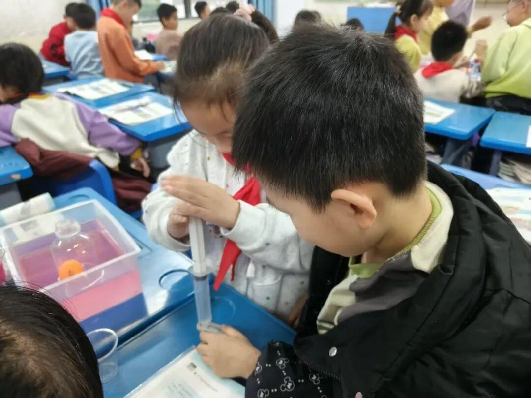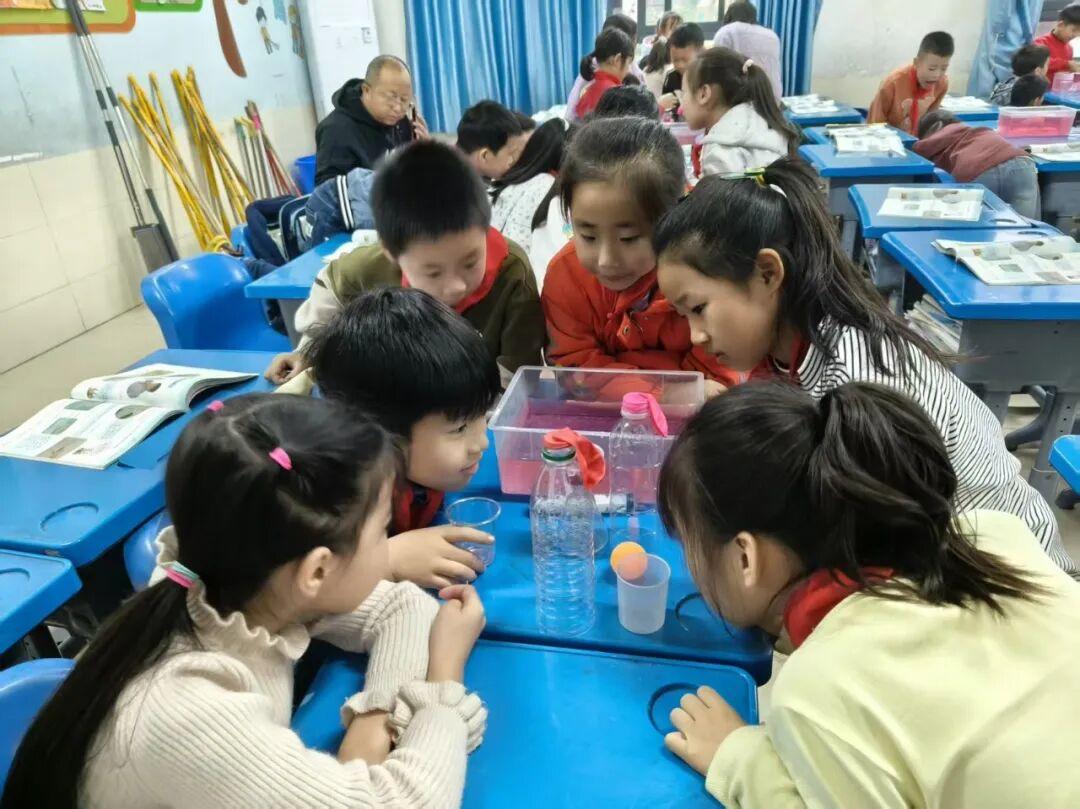随后的分组实验环节,杨老师将课堂主动权完全交给学生。孩子们以6人小组为单位,分工协作、动手操作:有的演示实验过程,有的仔细观察反应过程,有的快速记录实验现象。杨老师穿梭在各小组间,针对孩子们的疑问进行精准引导,鼓励他们大胆动手操作,发现问题,在试错中探索科学原理。小组汇报时,孩子们不仅展示了实验成果,还分享了操作中遇到的问题与解决方法,思维的碰撞让课堂充满活力。