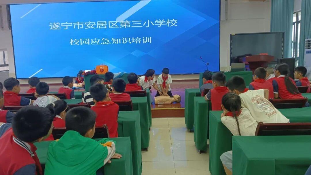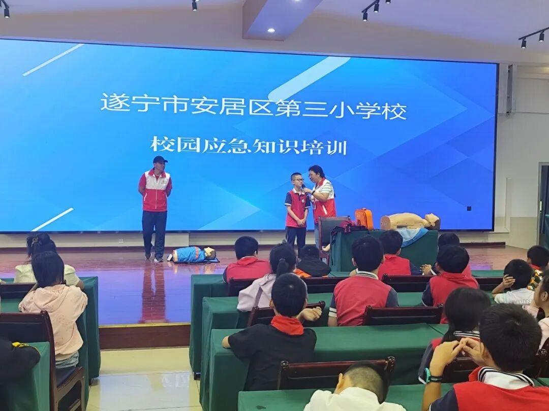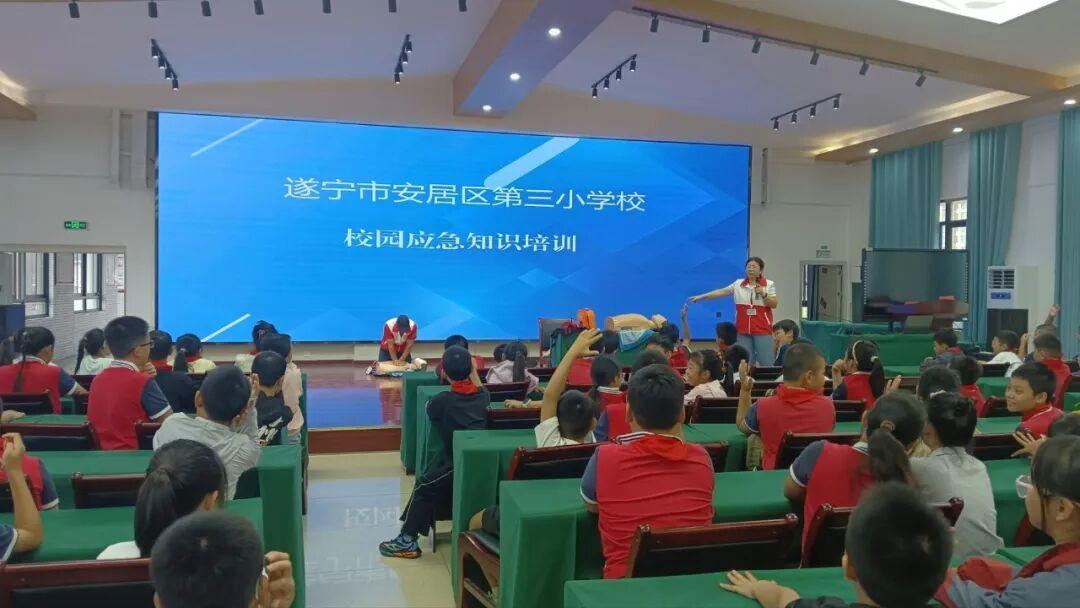 为进一步增强我校师生的安全意识,普及应急救护知识,提高在突发事件和意外伤害中的自救互救能力,构筑平安校园防线,2025年9月18日上午,安居三小特邀安居区红十字会专业培训团队走进校园,为全体师生带来了一场生动且实用的应急救护知识培训活动。