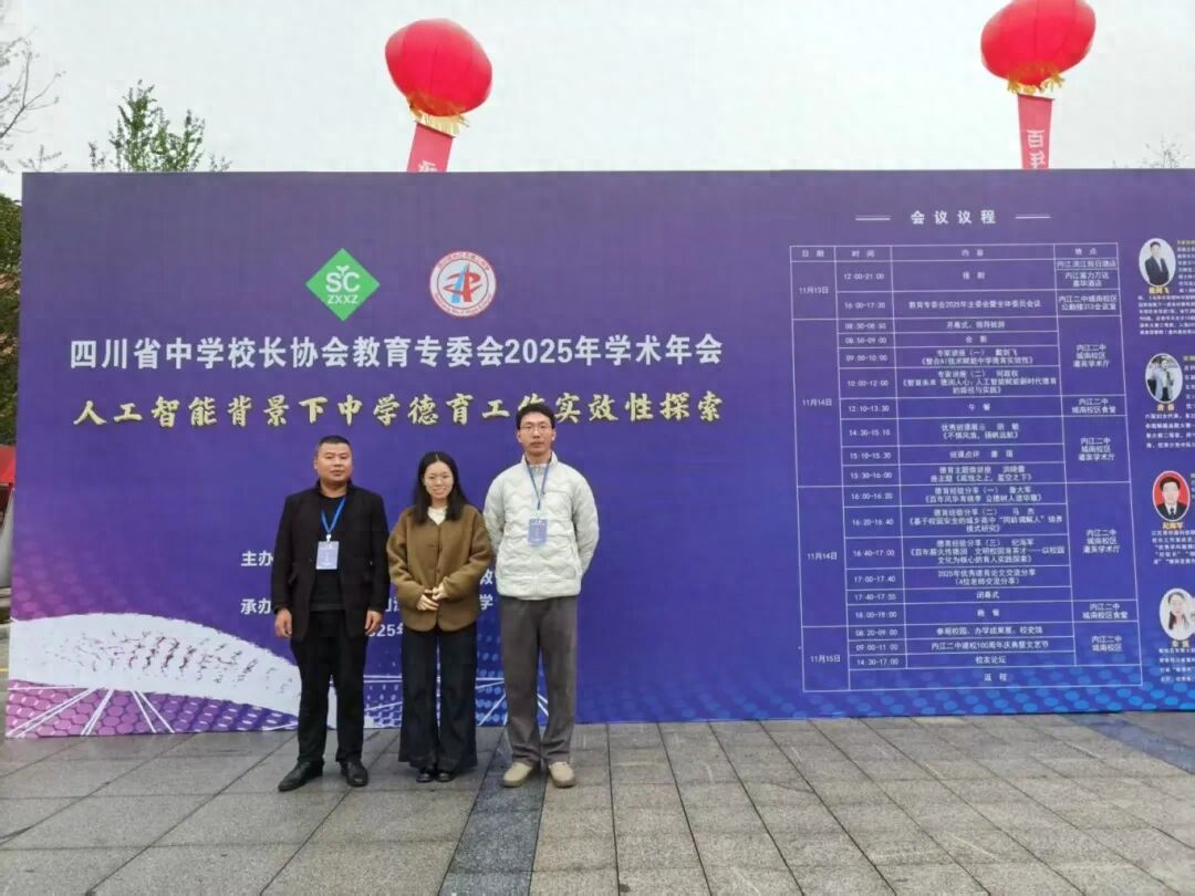 金秋送爽,丹桂飘香。2025年11月13日,遂宁四中(二中滨江校区)教师代表满怀期待,赴内江二中参加四川省中学校长协会教育专委会2025年学术年会。本次年会以“人工智能背景下中学德育工作实效性探索”为主题,聚焦新时代德育工作的创新与实践,致力于推广优秀德育经验,学习先进德育做法,拓宽育人视野,提升育人能力。
