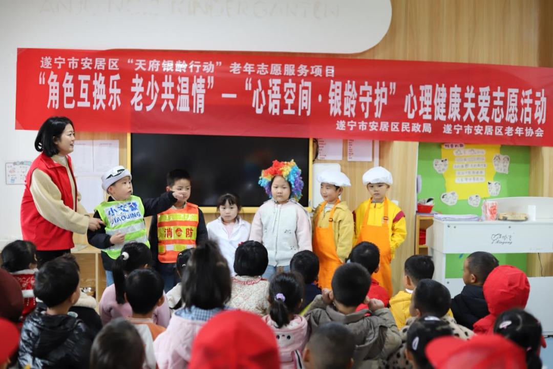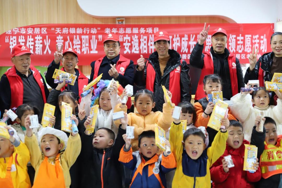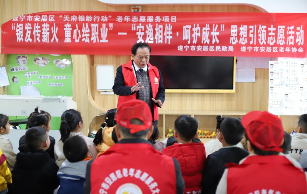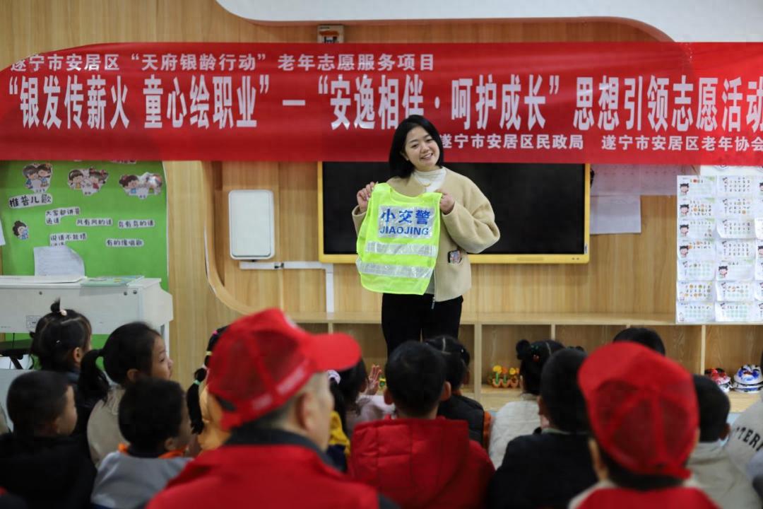 暖阳斜照,笑语盈盈。11月17日下午,遂宁市安居区第三幼儿园的校园里处处洋溢着温情与欢乐。安居区老年协会与安居三幼携手开展“安逸相伴・呵护成长——银发传薪火,童心绘职业”思想引领志愿活动,11位有着医生、律师、公务员等不同职业背景的老协会员,带着岁月沉淀的智慧与热情,与70余名萌娃共度了一段充满爱与探索的美好时光。